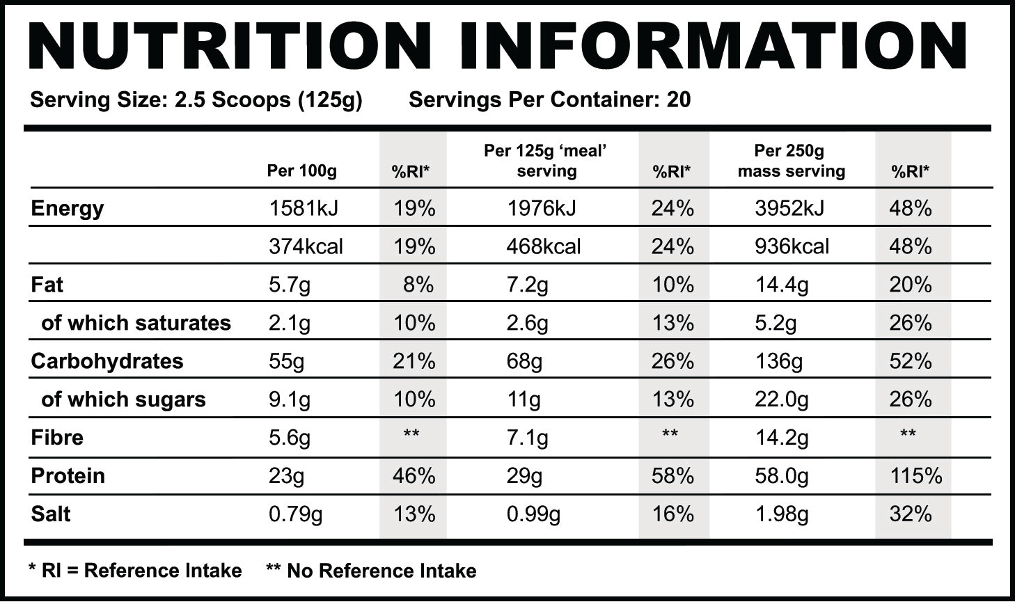 Formulated to offer a flexible 400 to 900 kcal serving size. Even at the smallest serving it boasts 28g of protein, of which + 20g is from complete whole protein sources (dairy and soy), with the 250g mass serve yielding a whopping 60g. There are no thickeners, gums or stabilisers, meaning fast digestion and no uncomfortable bloat. However, the product may settle once made - this is normal and desired as the liquid will leave the stomach quickly leaving you less full and ready to train hard.